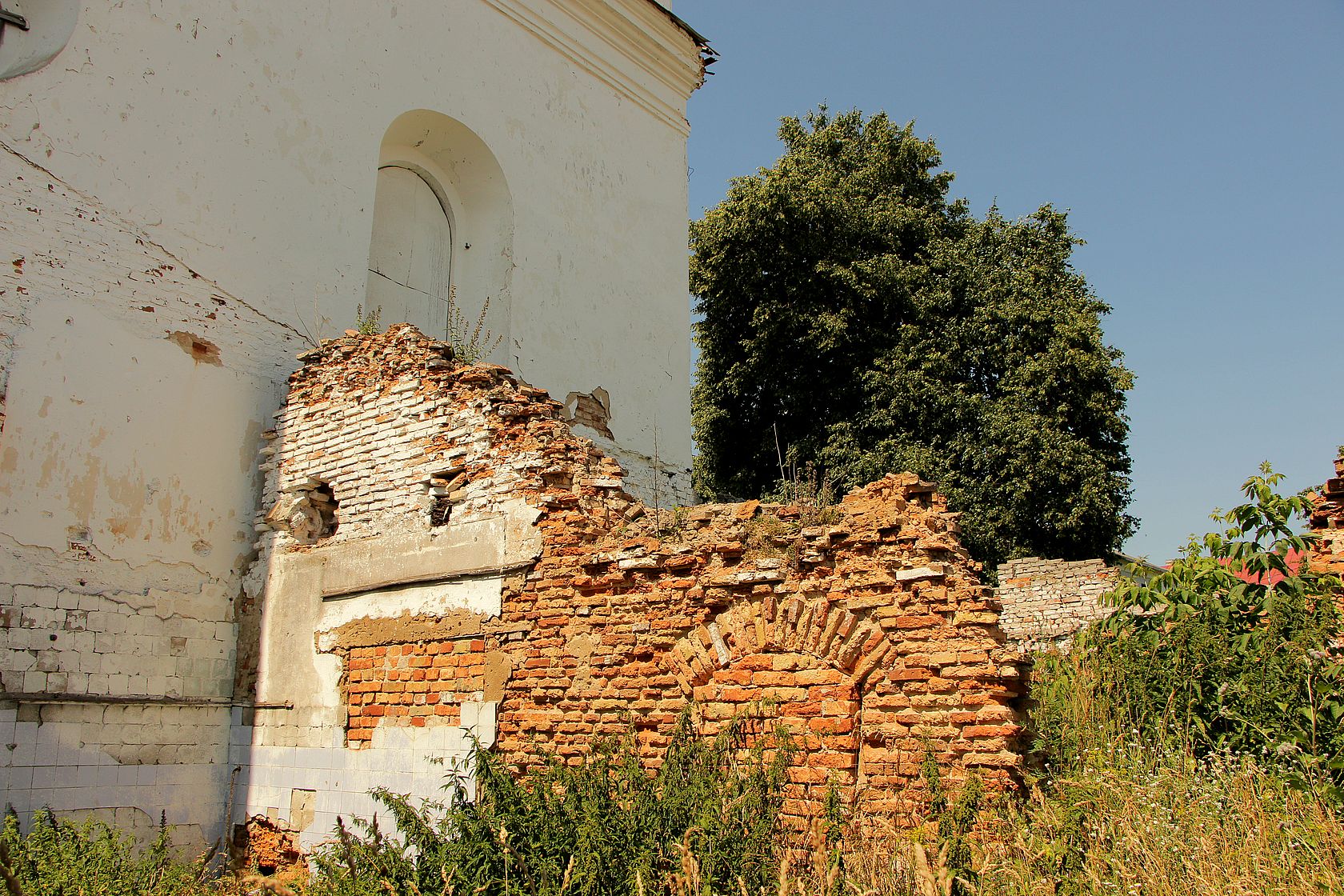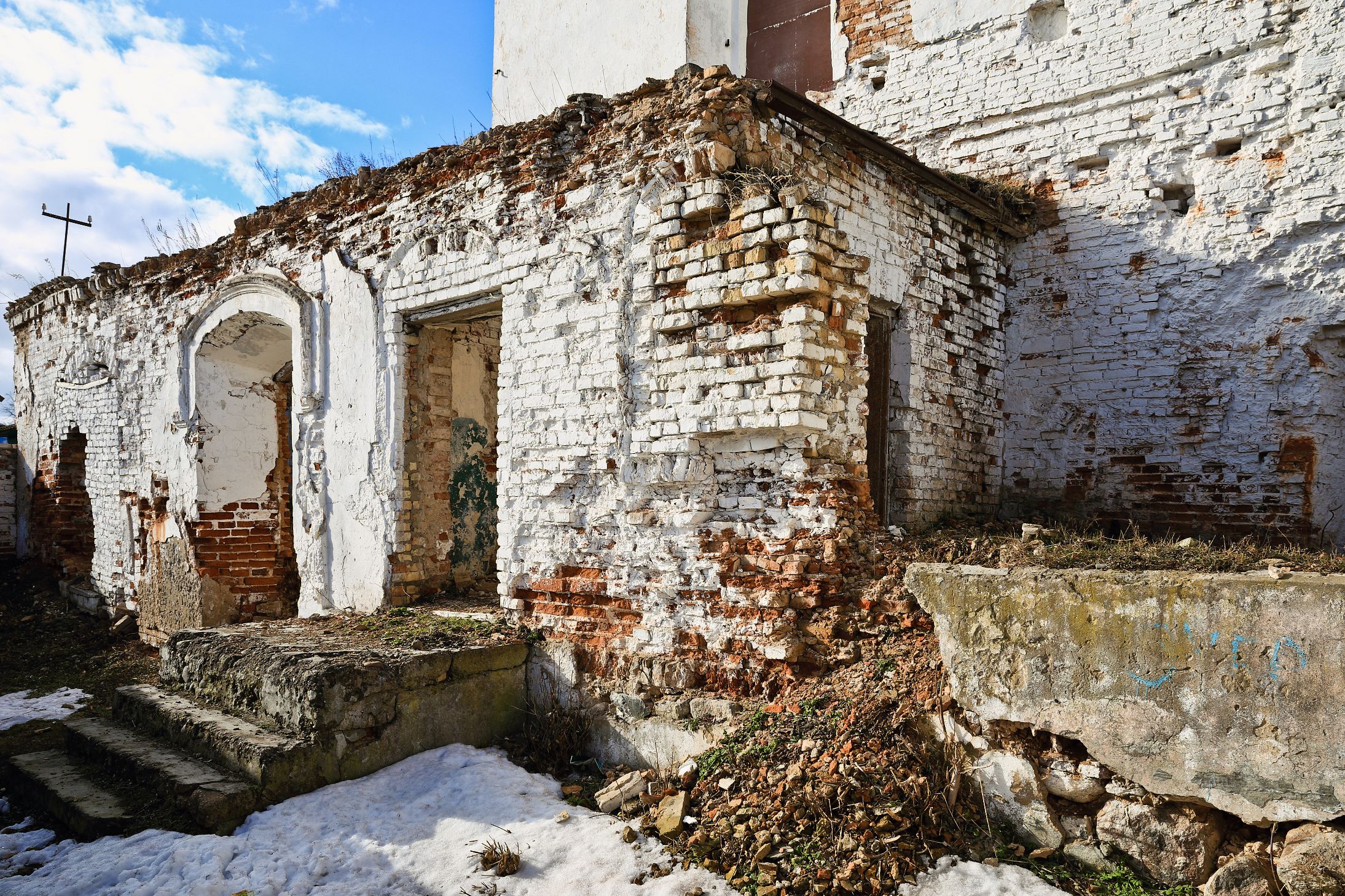 2.Помещение с тамбуром, изначально занимаемое хедером. Имеет отдельный вход. В советское время склад. Имело сводчатый потолок, декорированный растительной полихромией. В настоящее время сохранено на 5%. Помещение в силу особенностей геометрии имеет наибольший потенциал для размещения музейных экспонатов.